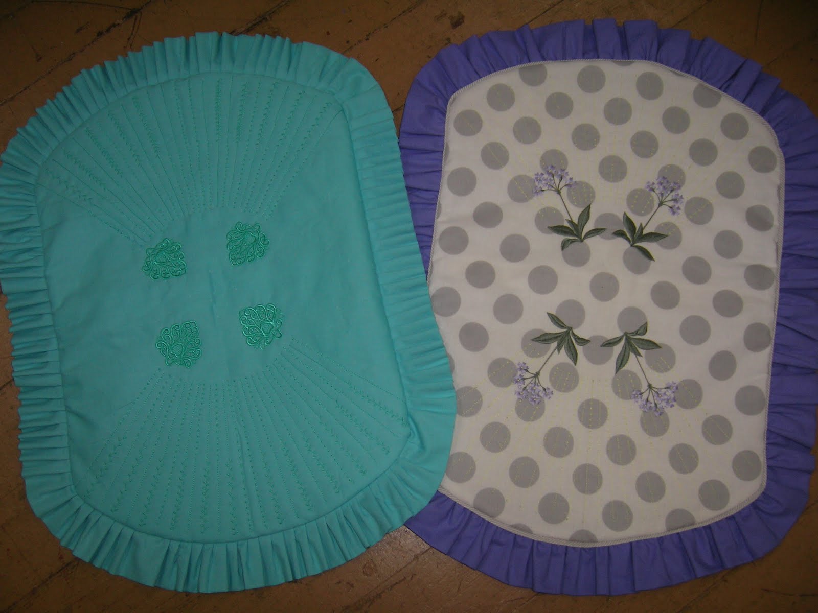 Marg made the aqua cover and Linda made the spotty version. This was the first project we did using the Sewing Revolution tools and rulers. All the covers turned out beautifully and different. It's not easy to see in the photo, but there are fancy stitches fanning out from the embroideries.